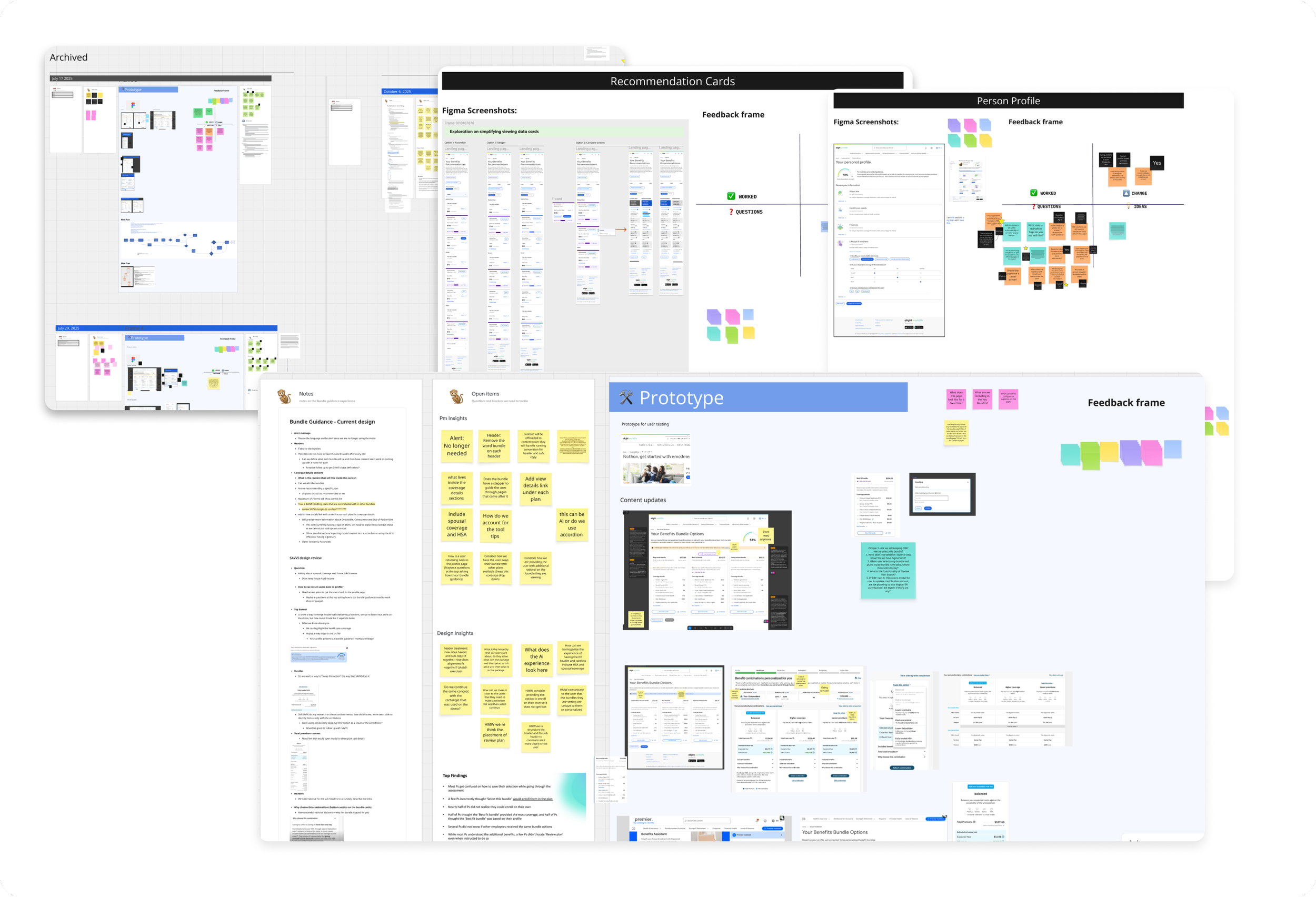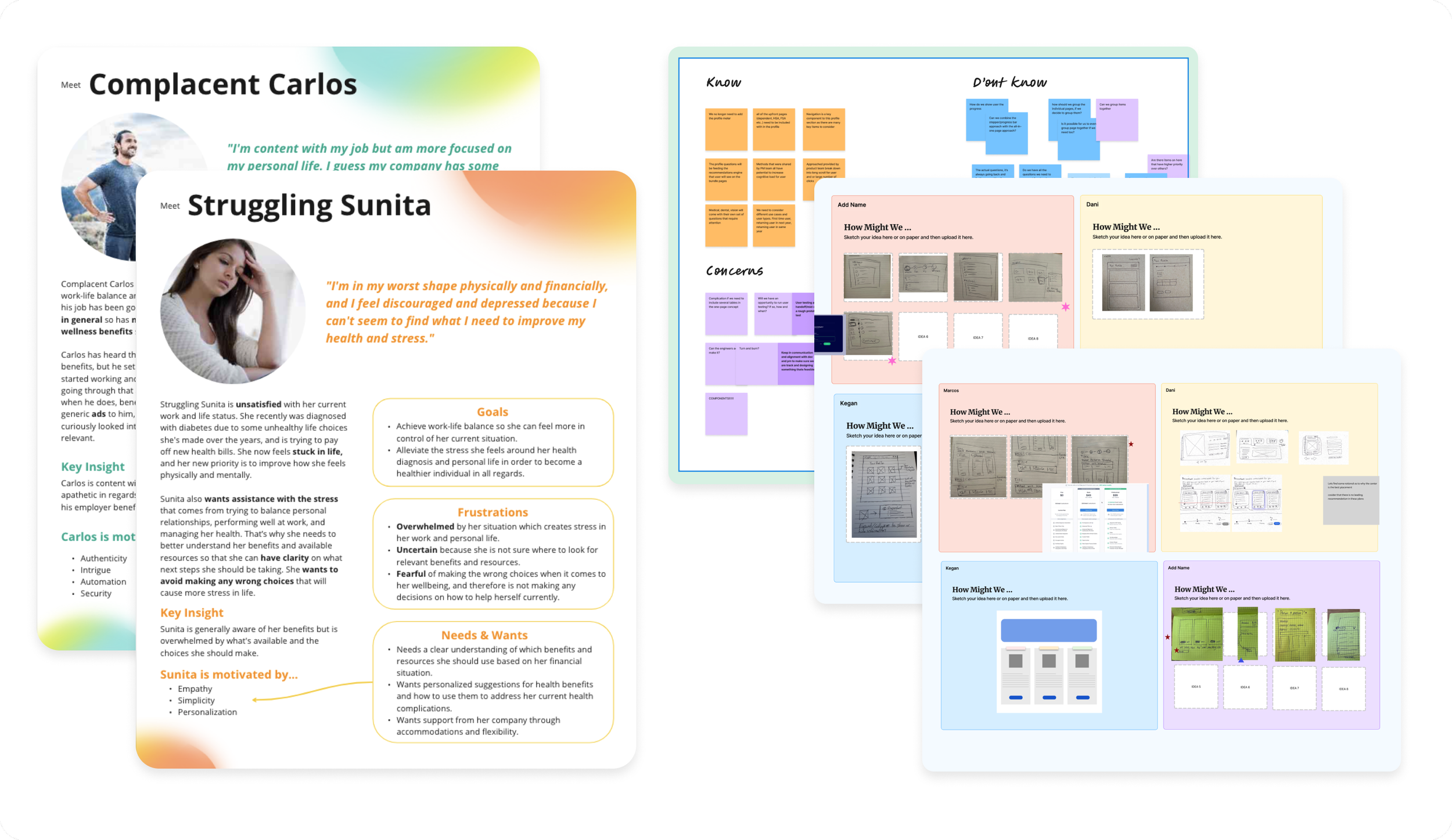 Building on existing research and personas, I led the team in synthesizing key insights to clarify the problem space and set design direction. We surfaced core issues including low user confidence, page turn fatigue, and unpersonalized plan options. To rapidly explore solutions, I facilitated a Crazy 8s workshop with product and design partners, driving alignment around high impact opportunities.
