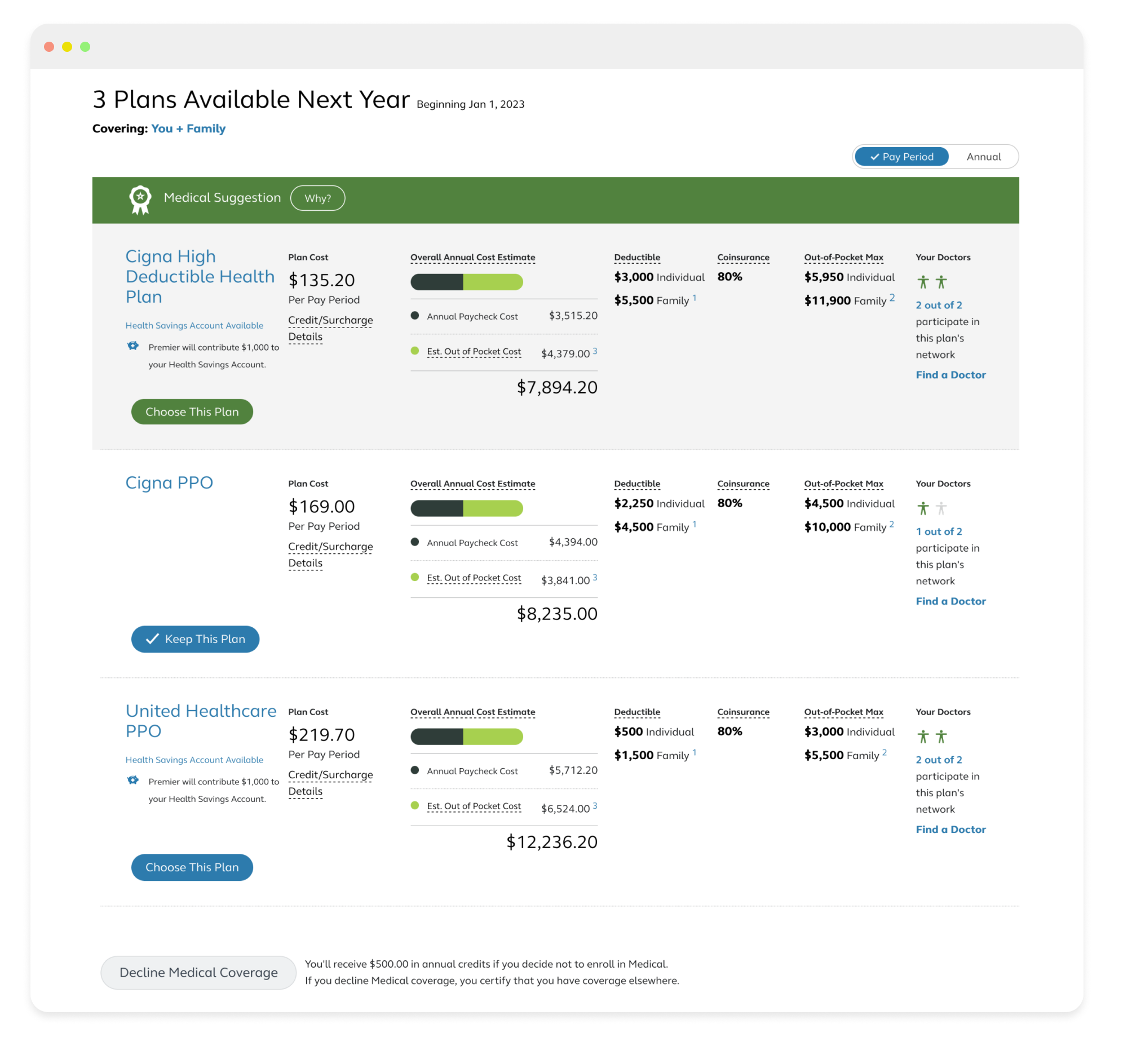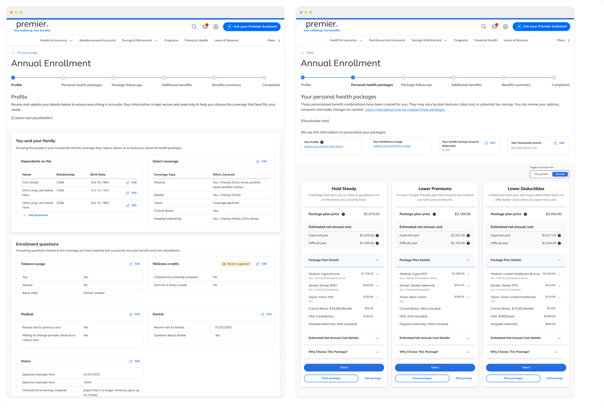 A streamlined, redesigned Annual Enrollment experience focused on personalized recommendations and a more compact way to present benefits, reducing page turns, cognitive load, and the effort required to make confident decisions.